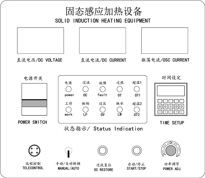 5.将工件放入感应圈内,严禁工件短路感应圈。用脚踩下脚踏开关(或按下面板加热开关),工件开始加热,待到工件达到温度要求时,断开脚踏开关(或按下面板停止开关)。