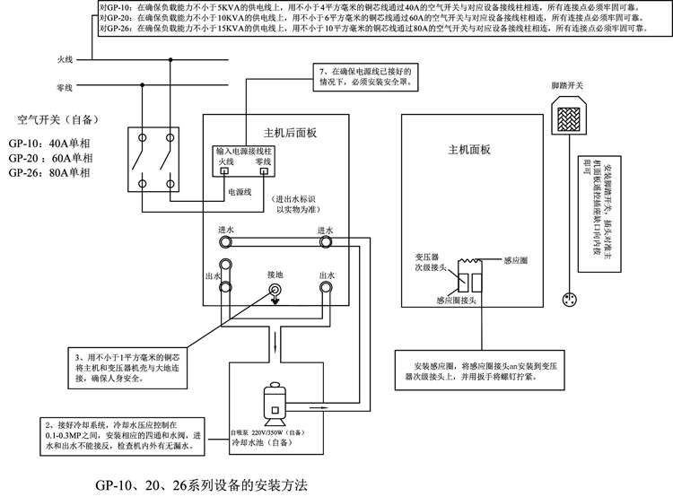 5、将工件放入感应圈内,严禁工件短路感应圈。用脚踩下脚踏开关(或按下面板启动开关),开始加热工件,待工件达到温度要求时,断开脚踏开关(或按起面板复位开关);
